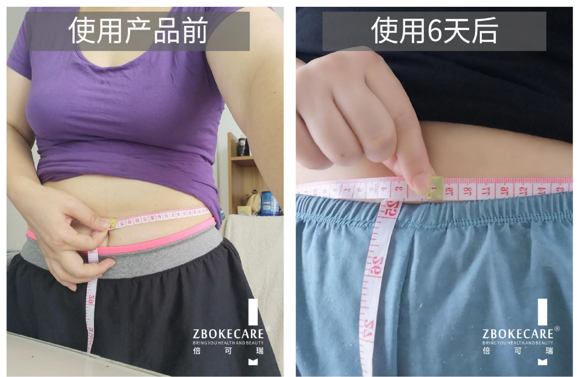 使用后:使用產品6天后,腹部皮膚變緊實、收緊,腰圍測量79公分,塑形6公分。