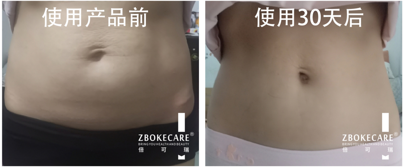 使用后:使用產品30天后,腹部收縮、收緊,體重減少,皮膚變嫩很多,腰圍測量77公分,塑形9公分。